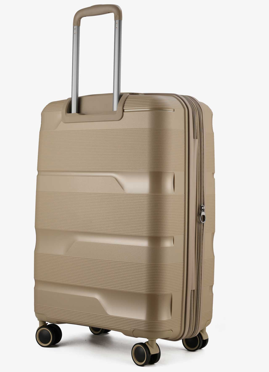 Series of suitcases Metallo. Stylish suitcases with an updated modern design. This medium-sized travel suitcase is a good choice for traveling at any time of the year, including hot summers. The suitcases are made of durable 100% polypropylene and have an aluminum retractable handle with a lock. Their silent double wheels rotate freely in different directions, and the TSA combination lock allows you to securely protect your luggage. And it is also worth paying attention to the new anti-scratch coating designed to prolong the use of our suitcases.
