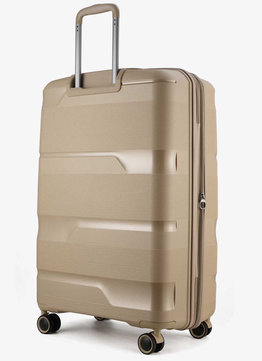 Серія валіз Metallo. Приваблива містка валіза з міцного матеріалу, а саме 100% поліпропілену. Ці сумки чудово підійдуть для літніх подорожей на будь-який смак. Вони дуже місткі та мають безліч корисних функцій, таких як безшумні подвійні колеса, що можуть вільно обертатися в різних напрямках, кодовий замок TSA та стійке до подряпин покриття. Валізи складаються з 2-х відділень і легко закриваються на блискавку. - обидві половини закриваються
